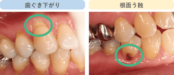 歯周病が進行したことによって歯の根っこが露出した場合も同様で、きちんと歯みがきができていなかったり、定期的に歯の検診やメンテナンスに行かれていなかったりすると、虫歯の発見が遅れてしまい、根っこが露出している多数の歯にわたり虫歯が及ぶ場合があります。